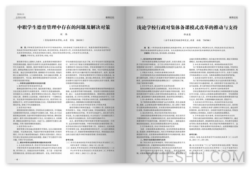 《新校园》主要栏目:基金项目高教论坛、硕博论剑、职教园地、成人教育、外语天地、教学探索等。